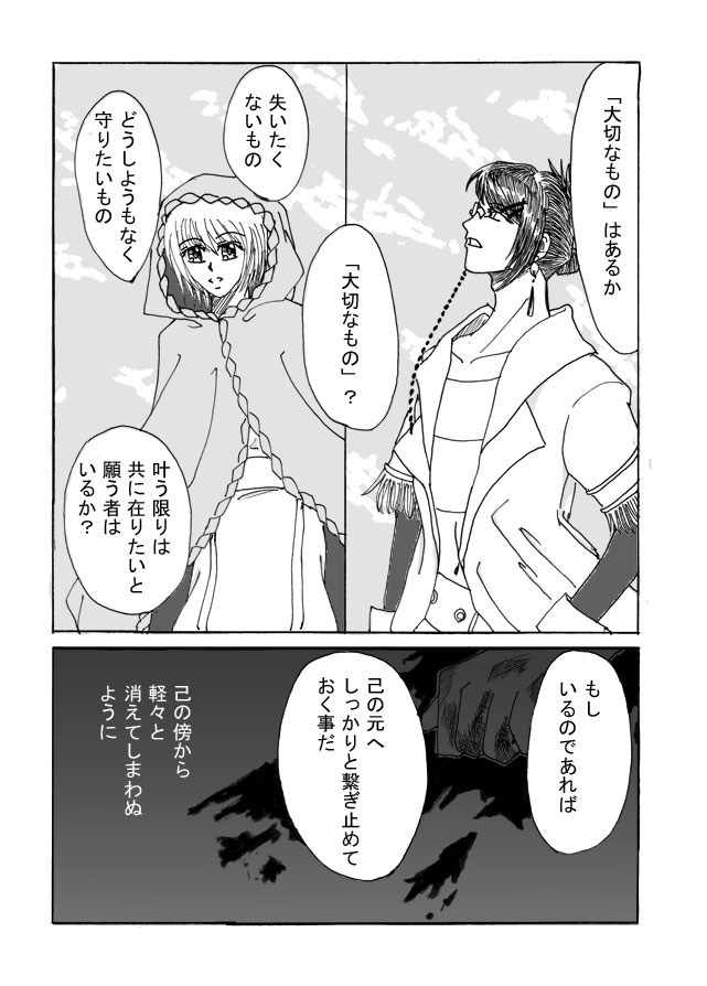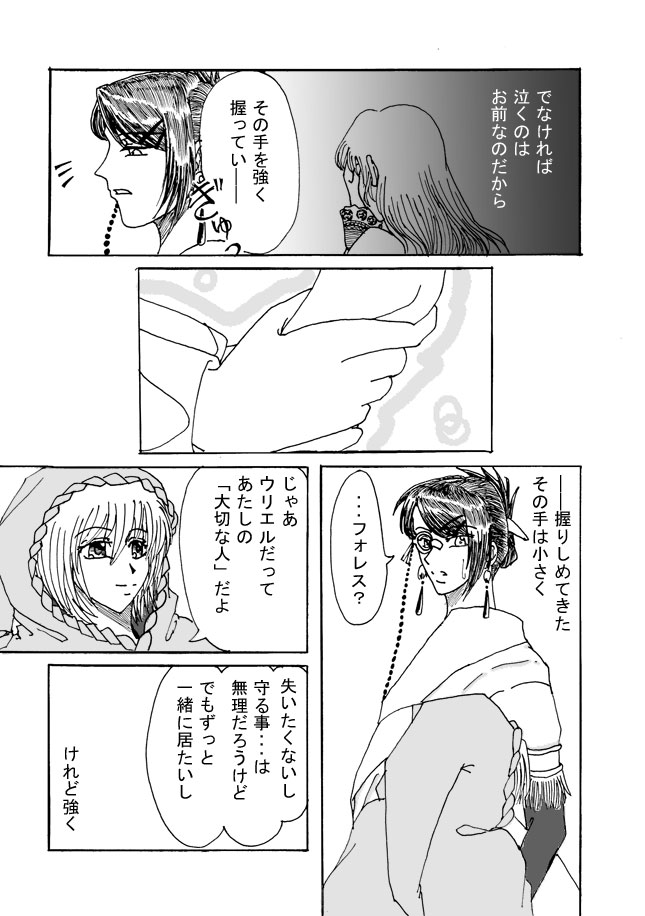 5ページ目ラスト、メファシエルの血を筆ペンでびしゃーーっとやってた時 無性に楽しかった・・・・・(←危険) ちなみにフォレスは本当は「〜なの」口調ですが、この漫画が 学校サークルの原稿用だったので、あえて差し支えない口調に直してあります^^;