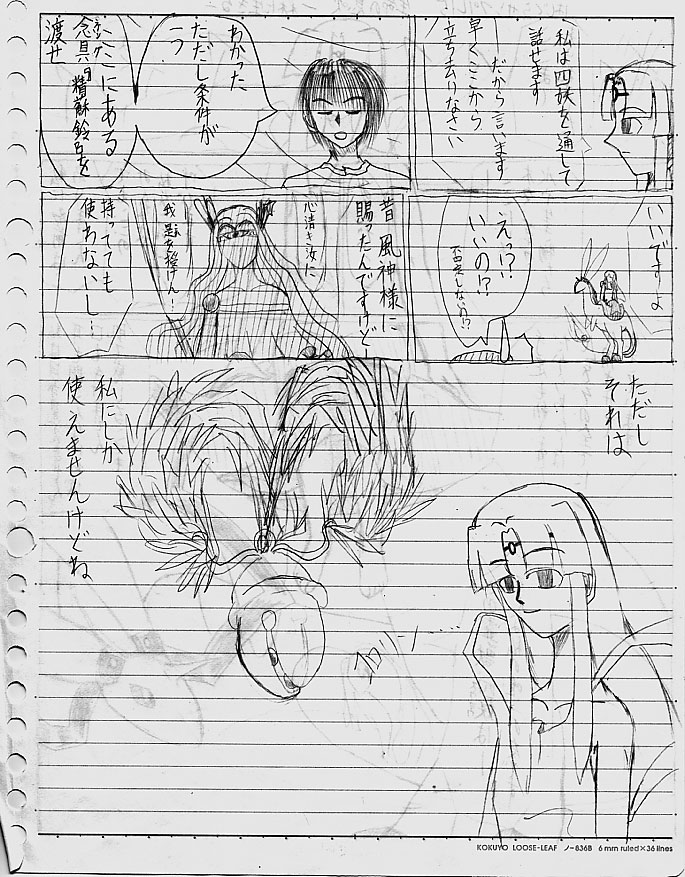 ―――で、この後に朱呂様と戸土ちゃんの出会いがあると。 精蘇鈴はこんな形です。翔風杖にもこれが付きます。 2ページ目の風神様、あれが旧Ver.の風神様です。(普通に先代ともいう)