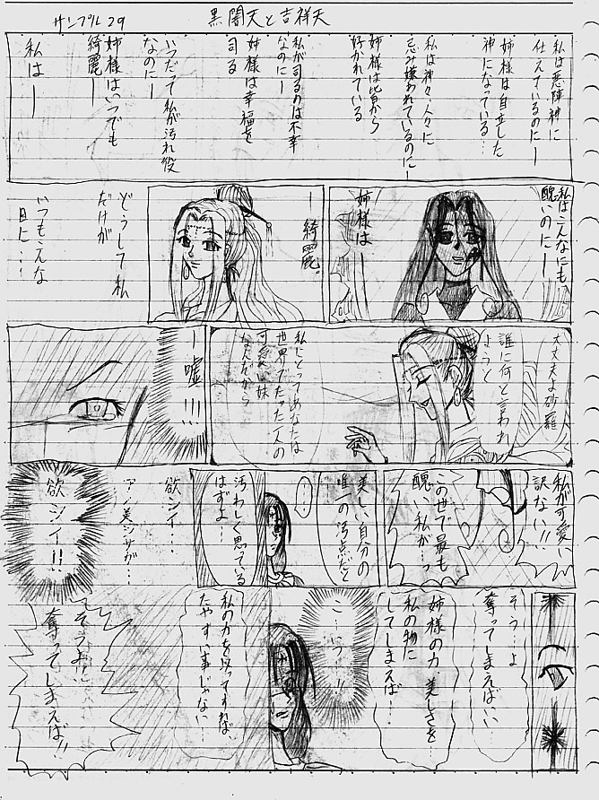 そしてこれが黒闇天。彼女の左頬の紋章、 もとは悪陣青竜(例のボツった初期悪役)のマークでした。 しかし友人にカッコイイと言われ、捨てがたく、転用したものです。^^;