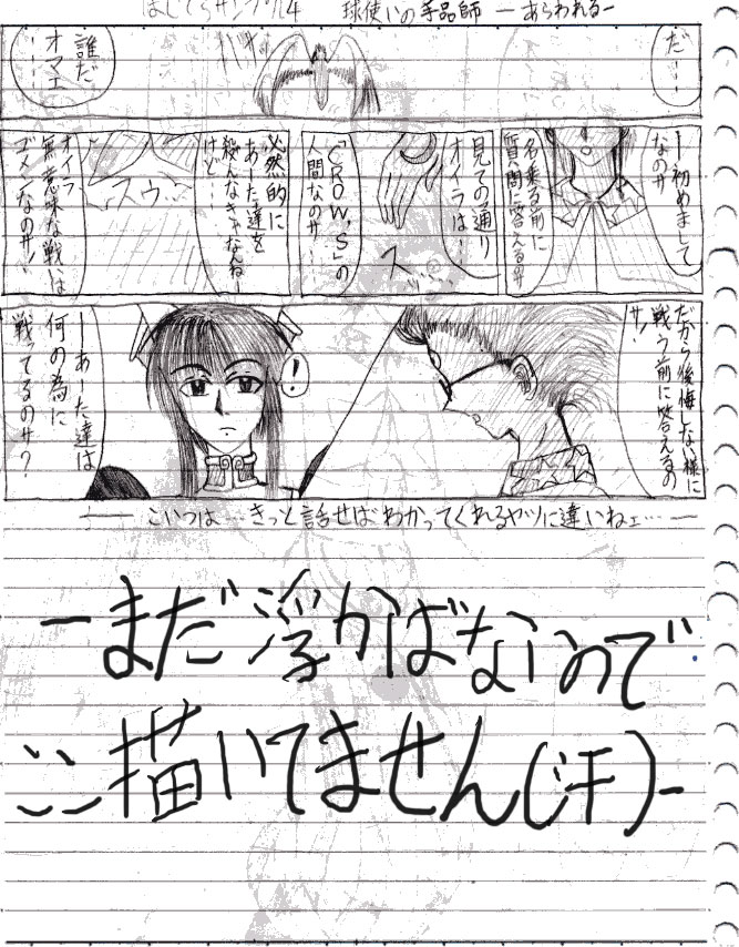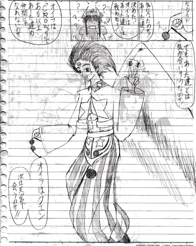 えー、以上!意味無くグラサンを外すクエンでしたっ! ラストのセリフ、「天宮で会うのサ!!」には、確か・・・・この後、天使達が 天宮を攻撃するという意味合いがあったと思うんですが。 うーん、今となってはよくわからなくなってしまった・・・ ちなみに、このサンプルは中1か中2くらいに描いてたサンプルを 高1になった時クエンを描き直しました。